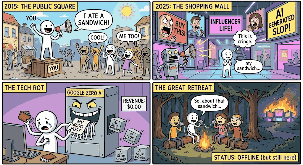 We realized that the "Public Square" was never really ours; it belonged to the advertisers, the algorithms, and the loudest voices in the room. So, we initiated the Great Retreat. We took our real lives off the main stage and moved them into the "Dark Forest" of the internet.